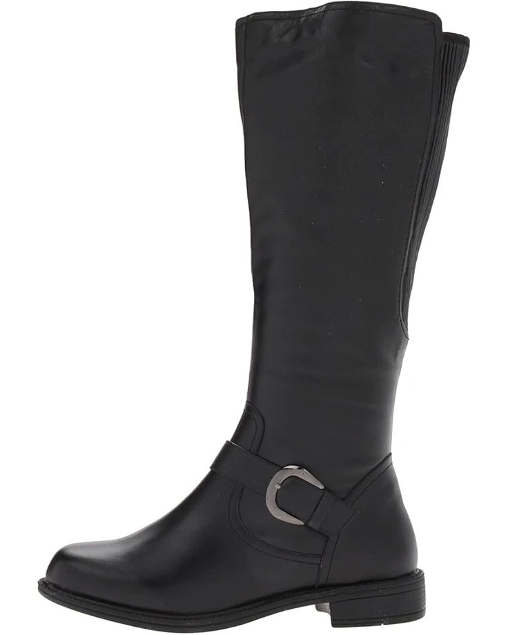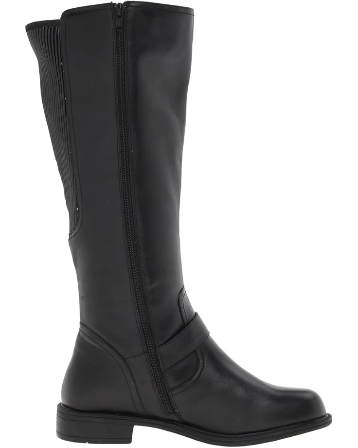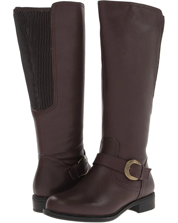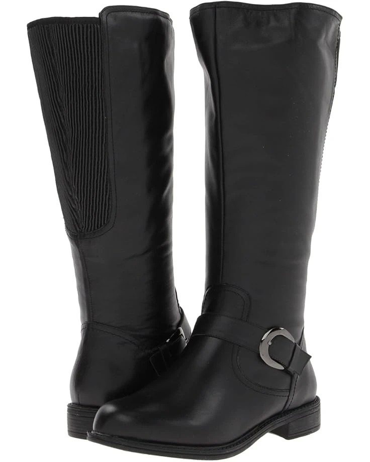 These boots are fantastic! I’m a vertically challenged person at 4’11” and I have muscular calves that are about 16″ at the widest point. Obviously that has presented a challenge for me to find tall boots that zip over jeans and leggings and that fit just below my knees. I’ve not been able to find any in stores that I could zip over jeans and have tried several pairs from Zappos (including others with a stated 18″ circumference) that didn’t work. I ordered these in a 6.5 M width and they are perfect! They were a bit hard to zip at first over jeans, but once I wore them around the house a little while, they zip with ease! They fit perfectly and hit me just below the knee. I also love that these have a wonderful smell of leather. They are very soft and supple and just feel great on my feet and legs. I ordered in brown and now I want the black ones. If you’ve had difficulty finding a wider shaft boot that works for you, I highly recommend you try these. I’m so glad I did!!