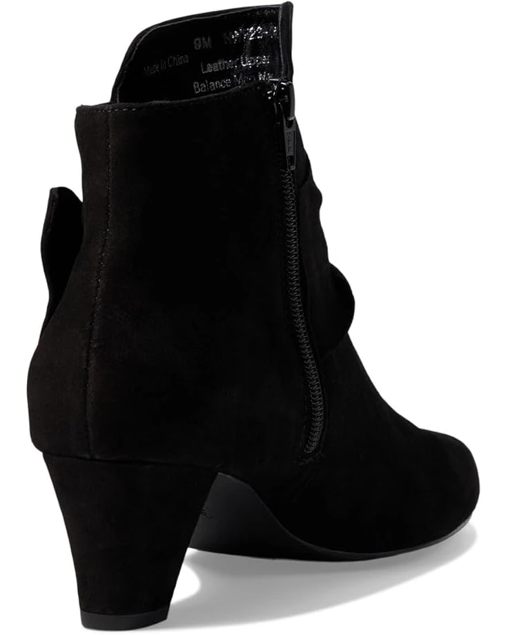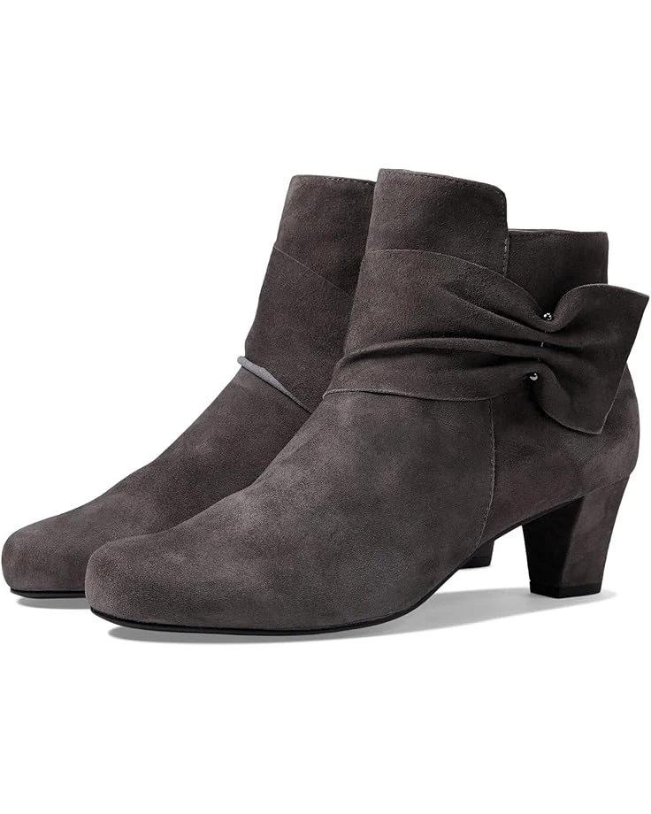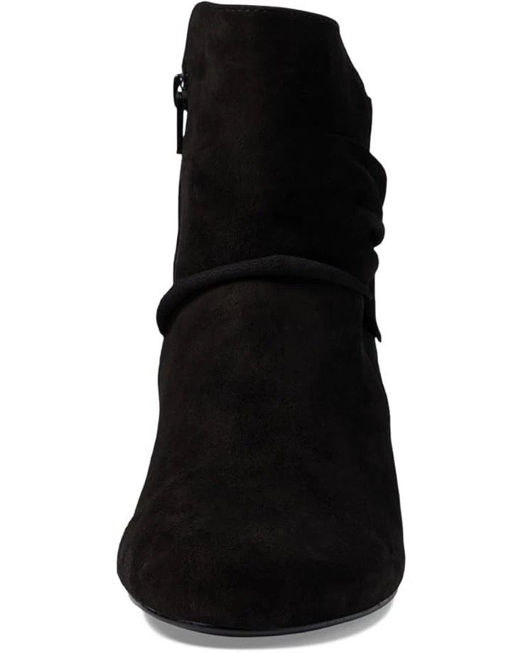 I ordered a half size up, and the fit is perfect. (Many thanks to the reviewers who provided that advice!) I’m a teacher, so I’m on my feet for long stretches of time. These booties have a stable heel and cushioned insole that make them extremely comfortable all day. I got them in black suede, and they work with dresses/skirts as well as pants because the height of the bootie itself (where it hits on the leg) isn’t too high – they’re more flattering than booties that rise up closer to the calf.